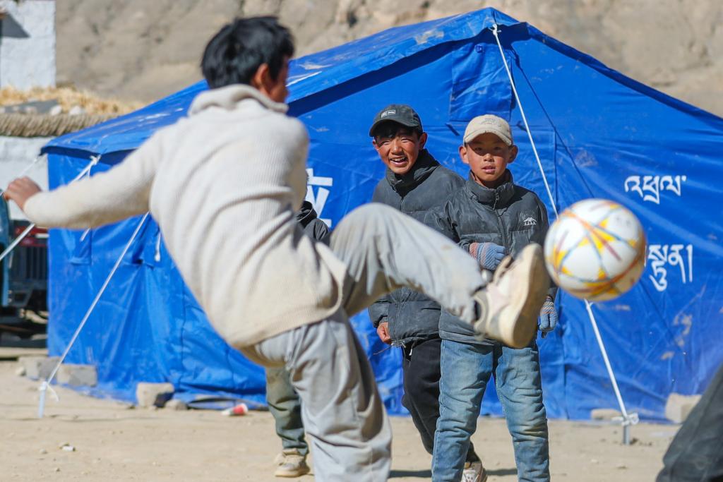 1月11日,在定日縣曲洛鄉(xiāng)措昂村,孩子們?cè)谂R時(shí)安置帳篷間的空地上踢足球。(新華社記者 沈伯韓 攝)