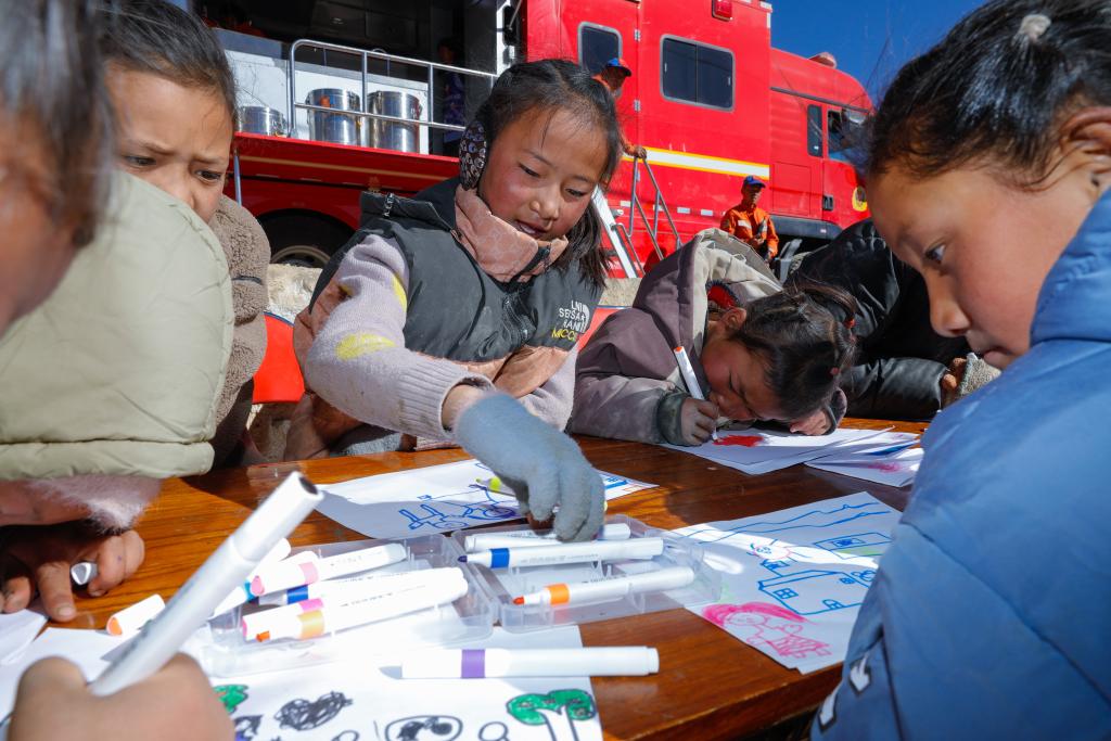 1月11日,在定日縣曲洛鄉(xiāng)措昂村臨時(shí)安置帳篷間的空地上,孩子們?cè)诋嫯?。(新華社記者 沈伯韓 攝)