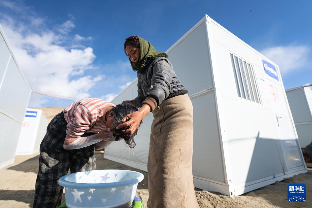 在定日縣長(zhǎng)所鄉(xiāng)嘎旦村,一位婦女在幫女兒洗頭(1月13日攝)。新華社記者 丁增尼達(dá) 攝