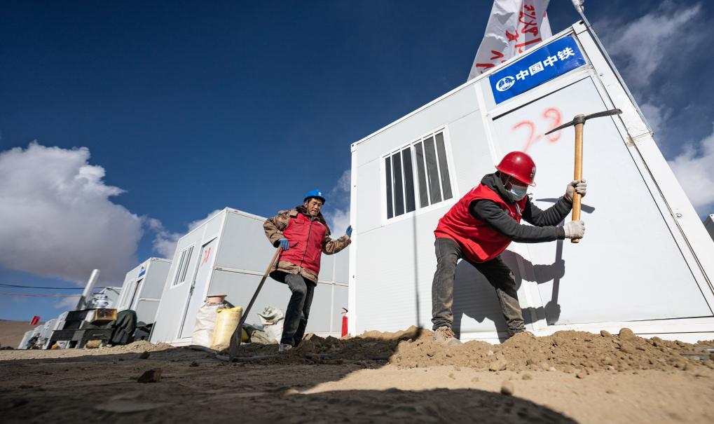 在定日縣長所鄉(xiāng)嘎旦村,國家電網(wǎng)工作人員在挖槽預(yù)埋電線(1月13日攝)。新華社記者 丁增尼達 攝