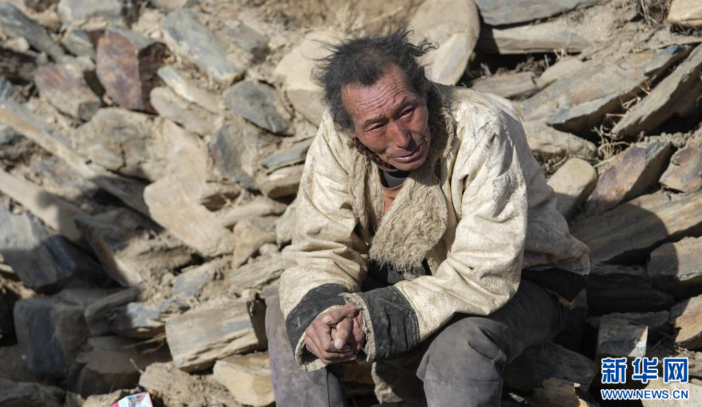 1月7日,古榮村的受災群眾在已成廢墟的家門口哭泣。新華社記者 晉美多吉 攝