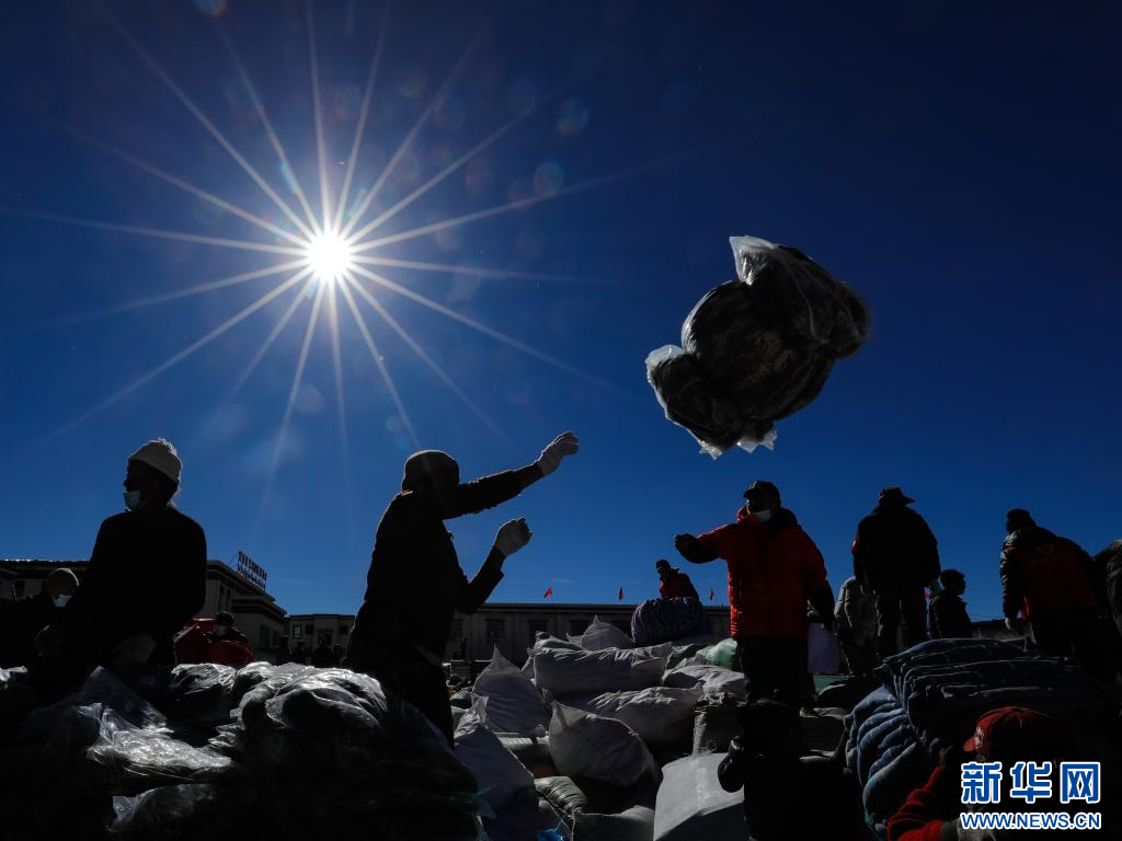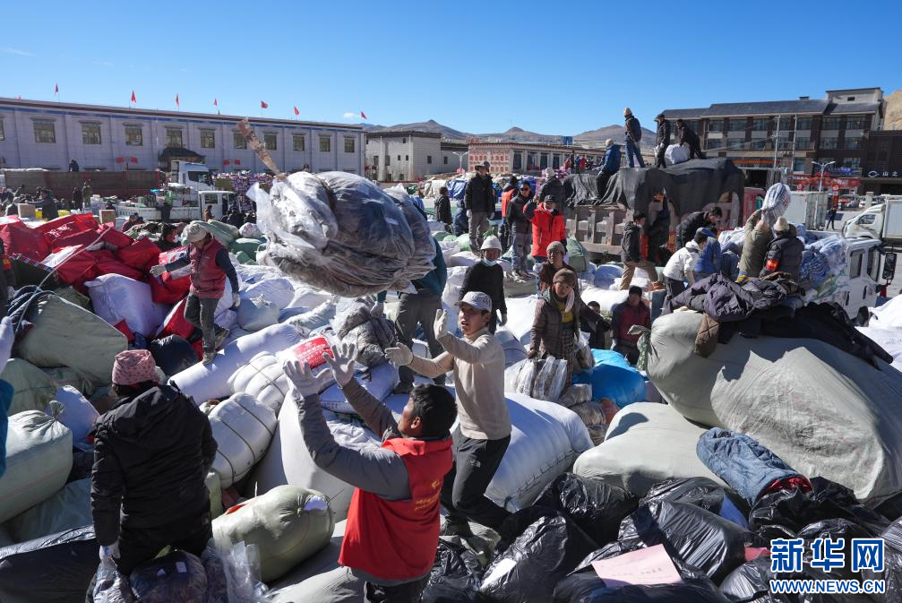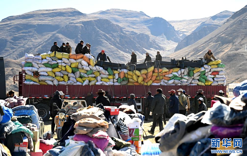 1月10日,在定日縣民族團結廣場,人們搬運將要運往受災群眾安置點的過冬物資。新華社記者 沈伯韓 攝