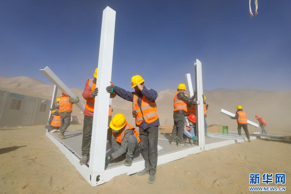 1月9日,中鐵二十局施工人員頂著風沙在長所鄉(xiāng)森嘎村安裝活動板房 。新華社記者 晉美多吉 攝