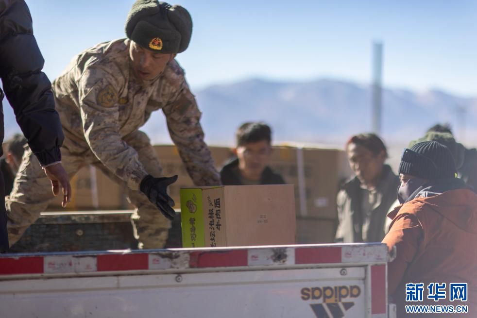 1月10日,在定日縣一處救災物資集中存放點,志愿者在合力搬運救援物資。新華社記者 晉美多吉 攝