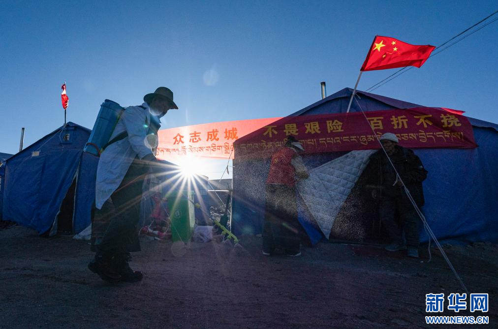 1月10日,在定結縣郭加鄉(xiāng)乃村安置點,村民在進行消殺工作。 新華社記者 丁增尼達 攝
