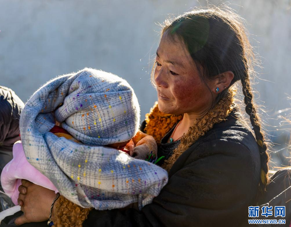 1月8日,定日縣長所鄉(xiāng)通來村的受災群眾措姆抱著自己的孩子在領取志愿者送來的御寒衣物。新華社記者 姜帆 攝