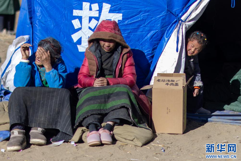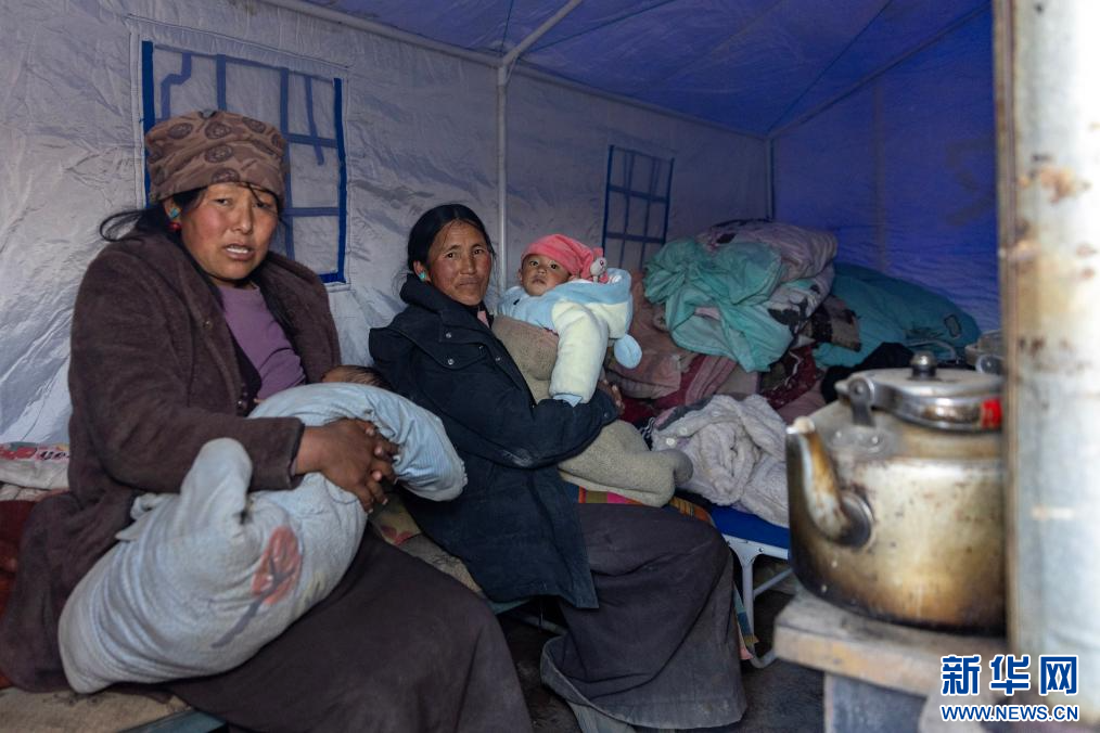 1月7日,兩位抱著孩子的受災群眾在拉孜縣曲下鎮(zhèn)土林村的應急帳篷里取暖。新華社記者 姜帆 攝