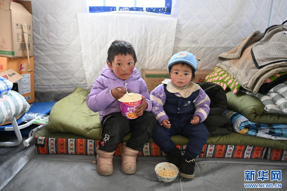 1月9日,拉孜縣芒普鄉(xiāng)一處安置點內,小朋友在溫暖的帳篷里吃泡面。新華社記者 李響 攝
