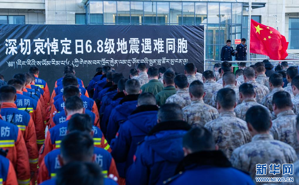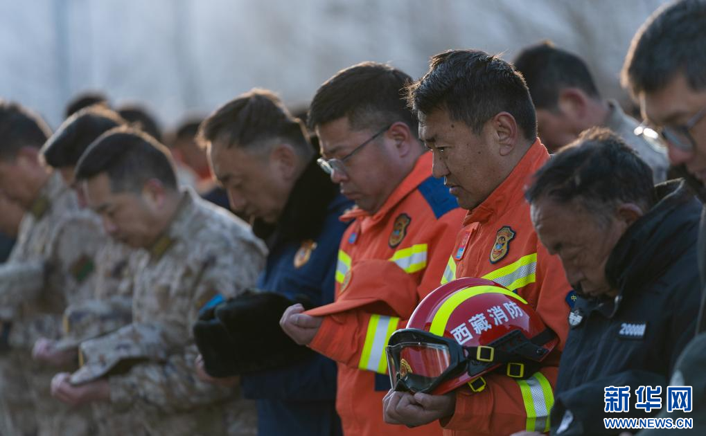 1月13日上午9時30分,西藏定日6.8級地震遇難同胞悼念儀式在受災最嚴重的長所鄉(xiāng)舉行。參與救援的解放軍和武警官兵、消防救援人員、公安民警、醫(yī)護人員、青年志愿者及有關企業(yè)員工、干部職工、震區(qū)群眾代表數百人,脫帽肅立,向遇難同胞默哀3分鐘。 新華社記者 丁增尼達 攝