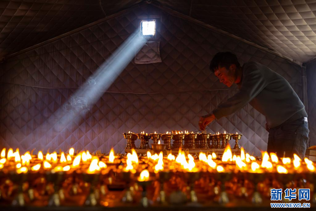 1月12日,在定日縣長所鄉(xiāng)古榮村,一名受災村民為在定日縣6.8級地震中逝世的親人點長明燈祈福。新華社記者 沈伯韓 攝