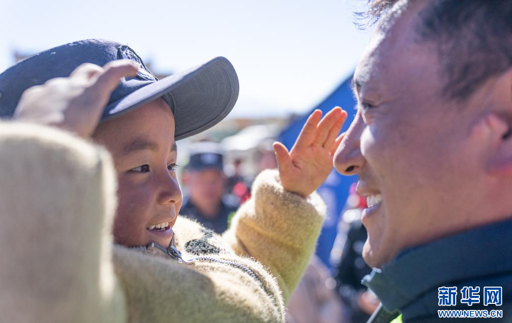 在定日縣長所鄉(xiāng)嘎布村,一個孩子戴上移民警察米瑪次仁的帽子敬禮(1月14日攝)。 新華社記者 丁增尼達 攝