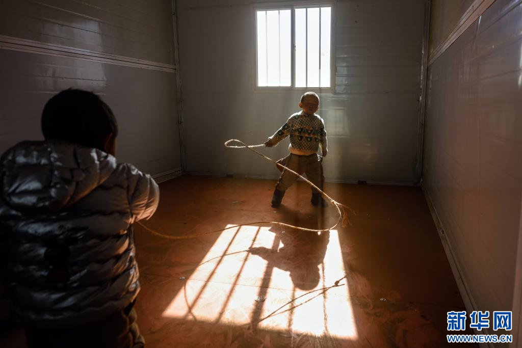 1月10日,在定日縣長所鄉(xiāng)古榮村,兩名小朋友在搬入的板房內玩耍。新華社記者 沈伯韓 攝