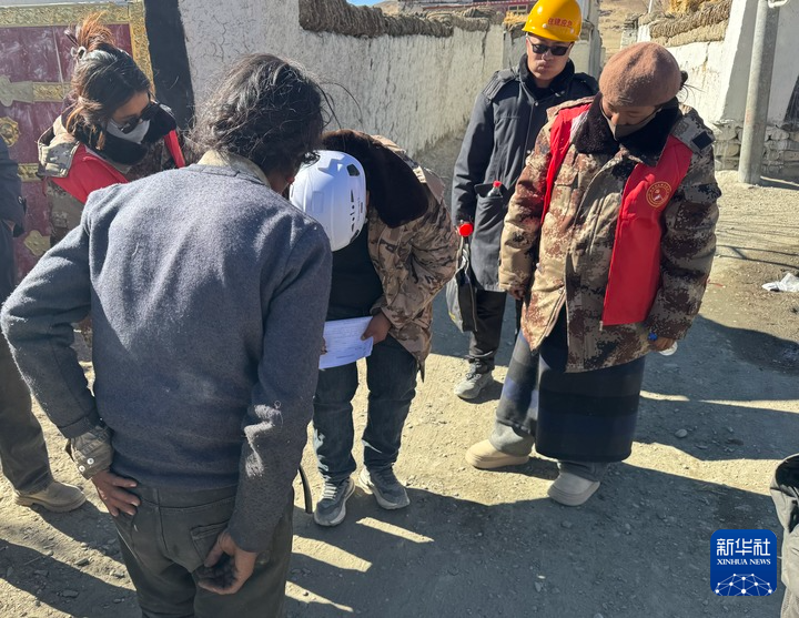 1月13日,次旺(右一)陪同工作組走訪村莊,評(píng)估房屋受損程度。新華社記者 格桑邊覺(jué) 攝