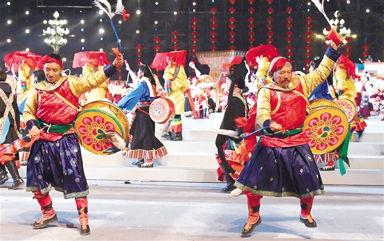 在七市(地)非遺舞蹈整合展示部分,歌舞節(jié)目《鼓潮》將熱巴鼓、背鼓、腰鼓、斯馬卓這四種西藏非遺舞蹈融合在一起,場(chǎng)面氣勢(shì)恢宏,給觀眾帶來震撼的視覺盛宴。