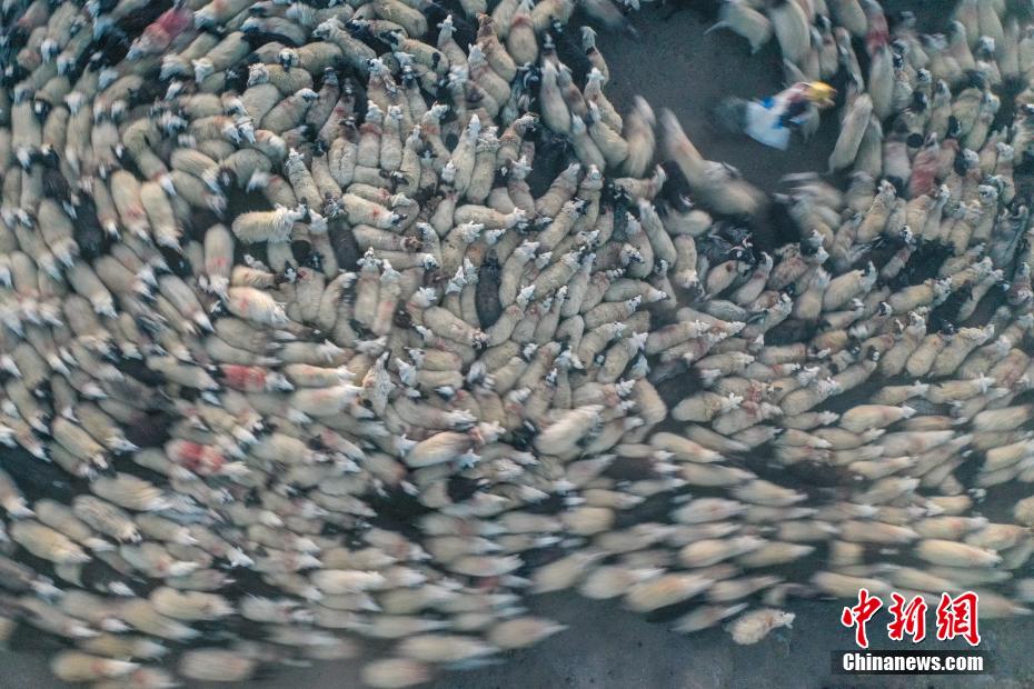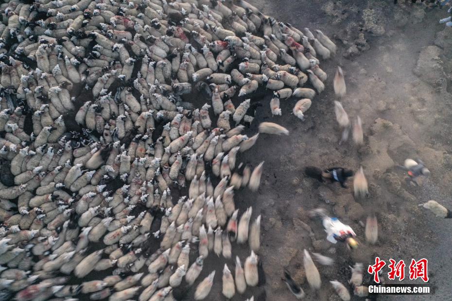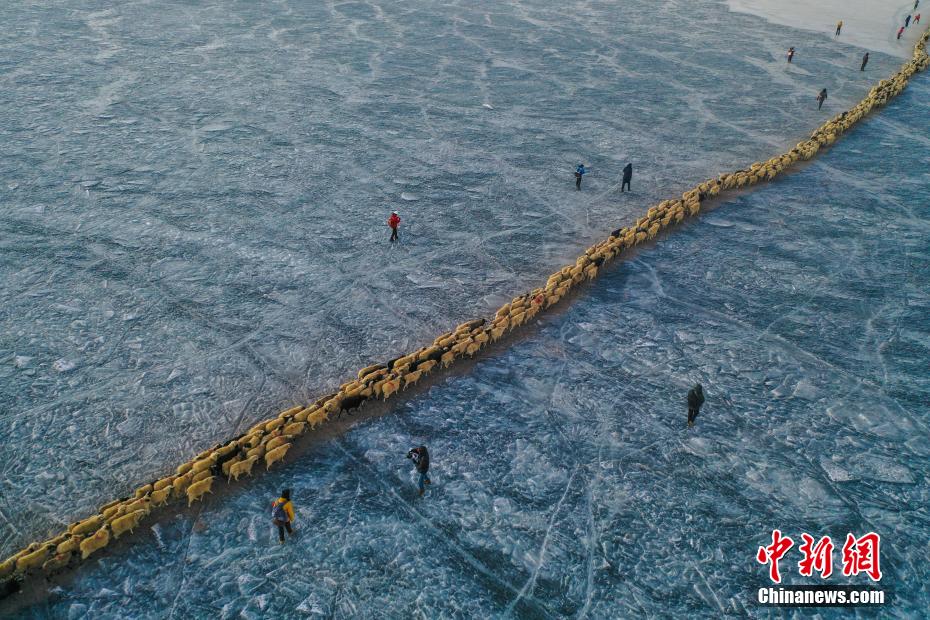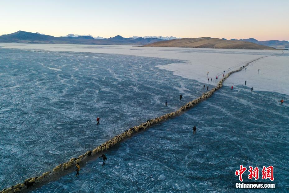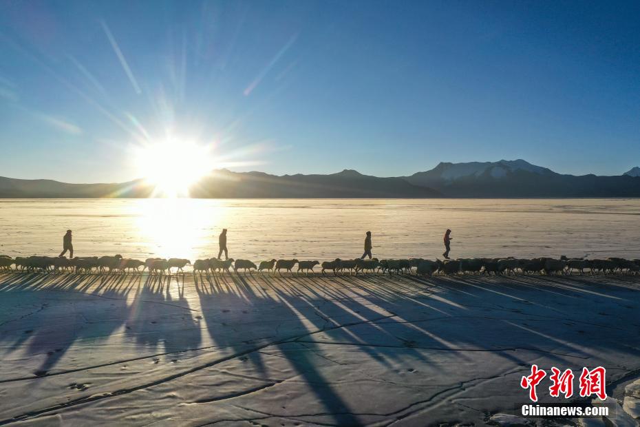 2月7日,西藏山南市浪卡子縣推瓦村1400多只羊通過普莫雍錯冰湖,前往湖心島。據(jù)悉,位于西藏山南市浪卡子縣的推瓦村,平均海拔約5070米,是世界上海拔最高的行政村,以牧業(yè)為主。由于推瓦村海拔高、夏季短,草場無法為羊群提供充足的過冬飼料,因此,每年高原最冷的時候,推瓦村牧民會把羊群趕到普莫雍錯水草豐茂的湖心島,依靠島上的草料度過最寒冷的冬期。圖為牧民準備趕羊轉(zhuǎn)場度過最寒冷冬期。(無人機照片)中新社記者 貢嘎來松 攝