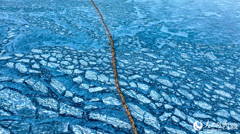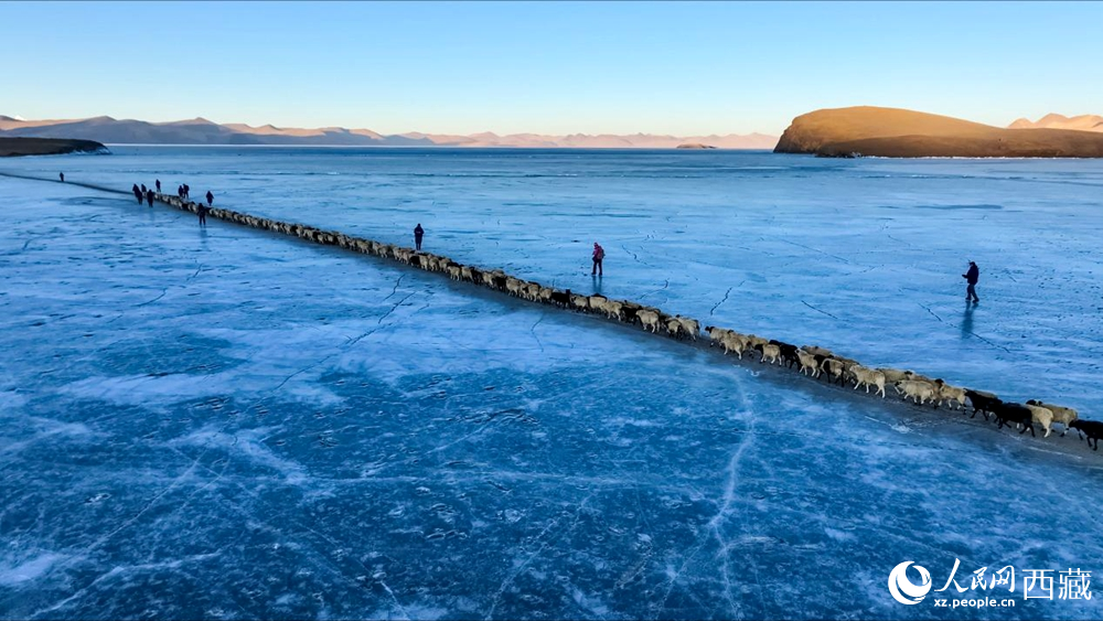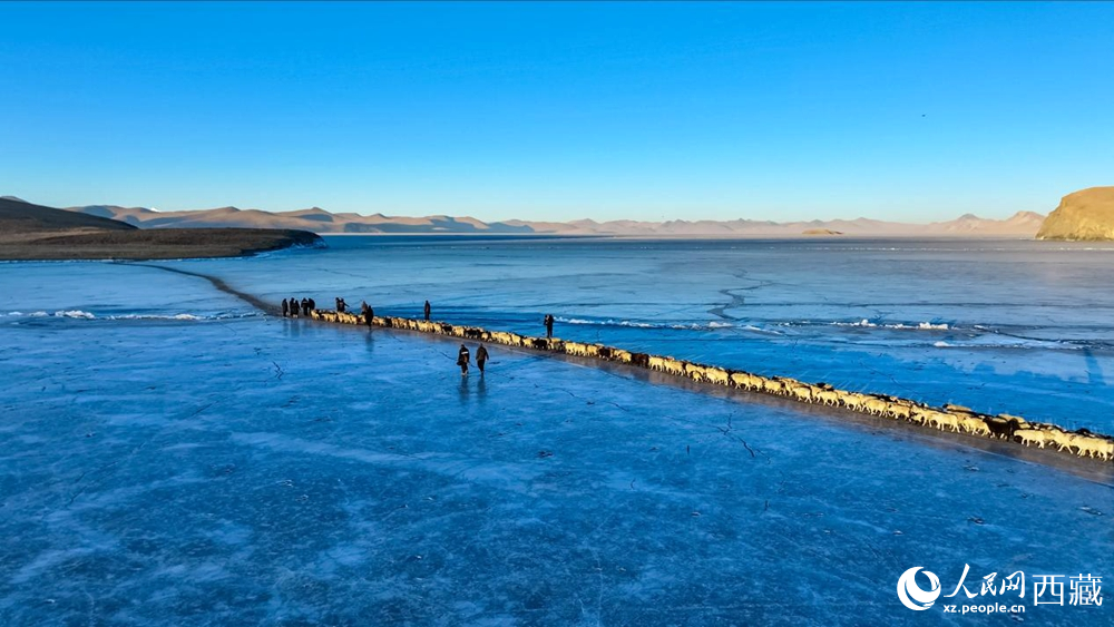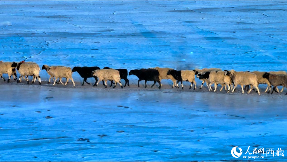 隨著一聲號令,牧民們驅(qū)趕著羊群,踏上冰封的湖面。遠(yuǎn)遠(yuǎn)望去,羊群如同一串串黑白相間的珍珠,在湛藍(lán)的冰面上緩緩移動,構(gòu)成一幅壯美的高原畫卷。