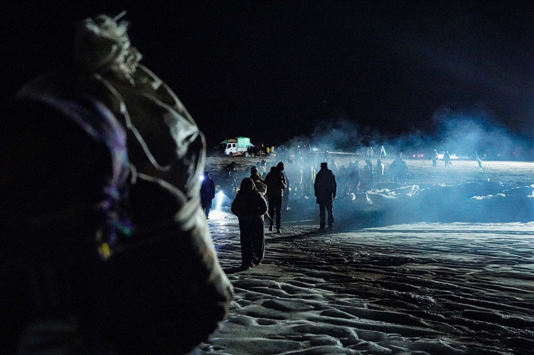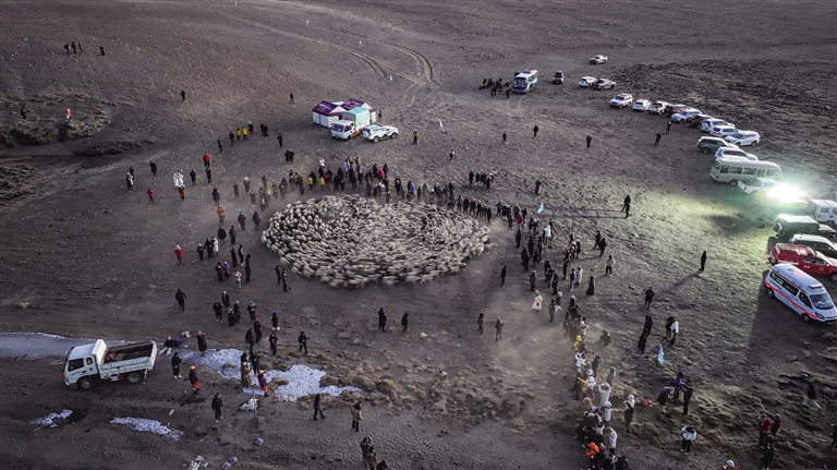 2月7日凌晨6點(diǎn),記者抵達(dá)普莫雍錯(cuò)。彼時(shí),滿天繁星閃爍,冰湖在星光映照下,幽藍(lán)深邃,宛如一片凝固的夢(mèng)幻之境。清晨的寒風(fēng)凜冽刺骨,可推瓦村的牧羊人們?cè)缫验_(kāi)啟了忙碌的一天。8點(diǎn),儀式結(jié)束,趕羊活動(dòng)正式拉開(kāi)帷幕。幾位牧羊人率先行動(dòng),在冰面上撒下?tīng)t灰,為的是給羊群鋪設(shè)“防滑步道”。一名牧羊人輕輕抱起小羊,率先踏上冰面,身后成群的羊緊隨其后,步伐緩慢而有序。冰面上,羊群細(xì)碎的腳步聲與冰層偶爾發(fā)出的輕微碎裂聲交織在一起,恰似大自然輕聲吟唱的歌謠。
