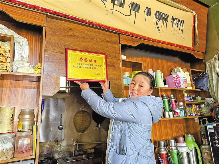 圖為次仁曲宗在門店懸掛“衛(wèi)生標(biāo)桿”獎(jiǎng)牌。記者 孫開(kāi)遠(yuǎn) 索朗曲珍 攝