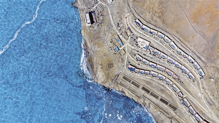 當(dāng)日,天空晴朗,在廣袤無垠、無樹木遮擋的曠野上,稍起一陣疾風(fēng),便會揚起一層薄薄的黃沙。從村委會出發(fā),沿著冰湖畔的水泥小路前行,很快就來到了村民倫珠曲珍的家。一進屋,厚實的木門便將凜冽的寒風(fēng)擋在了門外。“快請進,這幾天風(fēng)沙有點大,普莫雍措都沒以前藍了?!眰愔榍湟贿呹P(guān)門一邊熱情地笑著說道。