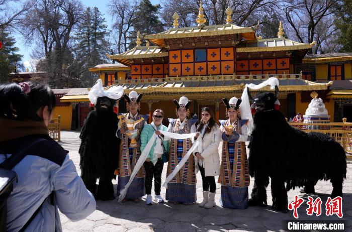 圖為歡迎儀式現(xiàn)場,香港游客在羅布林卡與工作人員合影留念。中新社記者 李林 攝