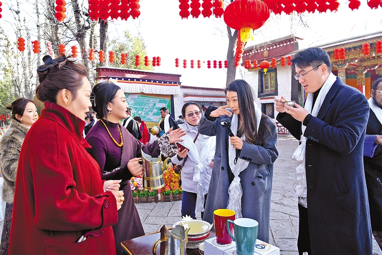 隨著一聲聲“扎西德勒!”“新年快樂!”的祝福語響起,身著盛裝的工作人員站在切瑪盒旁邊,熱情地教游客吃“切瑪”?!扒鞋敗焙欣餄M滿的青稞粒和糌粑,再加上金燦燦的酥油花和染成紅綠兩色的“羅薩梅朵”麥穗的裝點,象征著五谷豐登、福澤綿長。來自廣東的游客張女士一家是專程趕來過藏歷新年的,想來體驗不同年味兒的她輕捏一撮切瑪撒向空中:“愿我們?nèi)医】灯桨?,也祝祖國繁榮昌盛!”