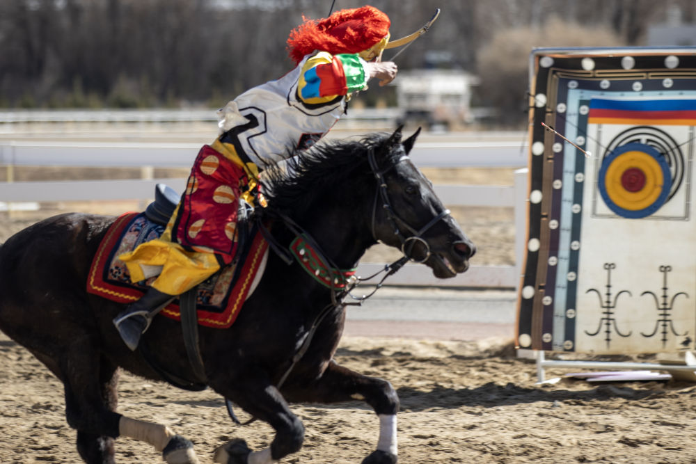 馬術(shù)隊(duì)員在表演“馬上民族傳統(tǒng)響箭五連靶”項(xiàng)目