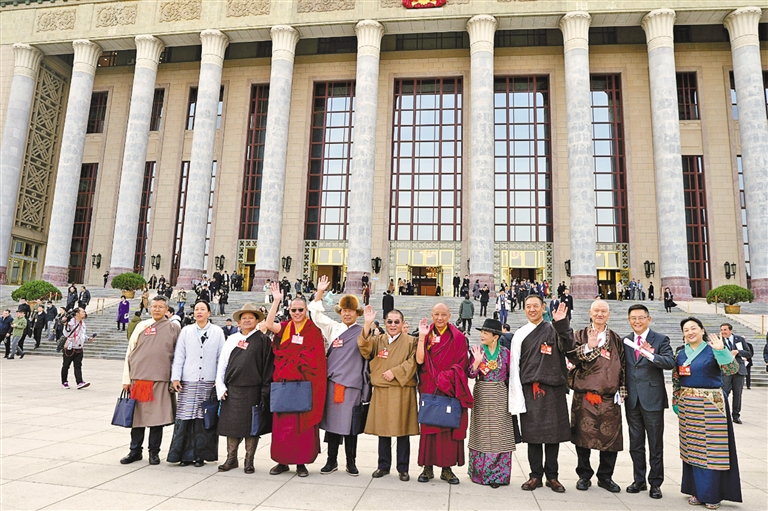 圖為住藏全國政協(xié)委員身著盛裝、滿懷豪情,在人民大會堂前合影留念。記者 丹增平措 攝