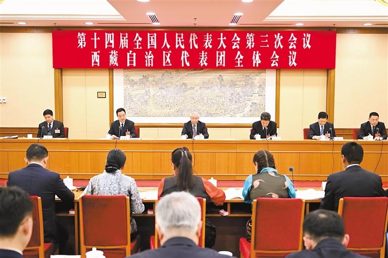 3月5日下午,十四屆全國人大三次會議西藏代表團舉行全體會議,審議政府工作報告。