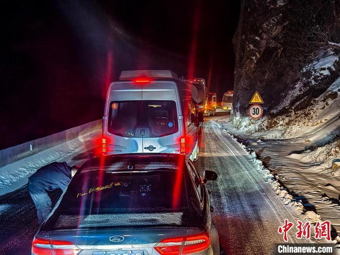 當(dāng)夜幕降臨之時(shí),大風(fēng)夾著雪粒呼嘯不止,山上的氣溫也越來(lái)越低,部分司乘人員出現(xiàn)焦慮,官兵們一邊耐心地安撫司乘人員焦急的情緒,一邊有條不紊地指揮車輛緩緩挪動(dòng)。