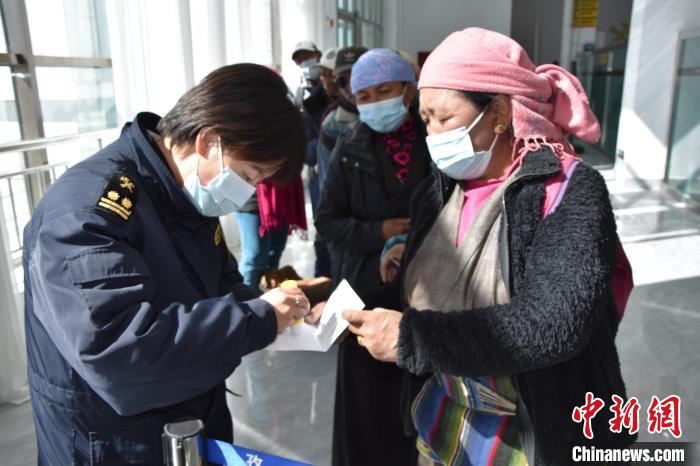 圖為日喀則海關里孜口岸女關員協(xié)助入境邊民粘貼入境識別碼。拉薩海關供圖