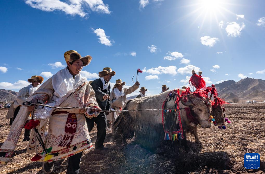 3月16日,在西藏拉薩市林周縣春堆鄉(xiāng)春耕典禮現(xiàn)場,農(nóng)民沿襲傳統(tǒng),使用“二牛抬杠”的方式翻土犁地。新華社記者 晉美多吉 攝