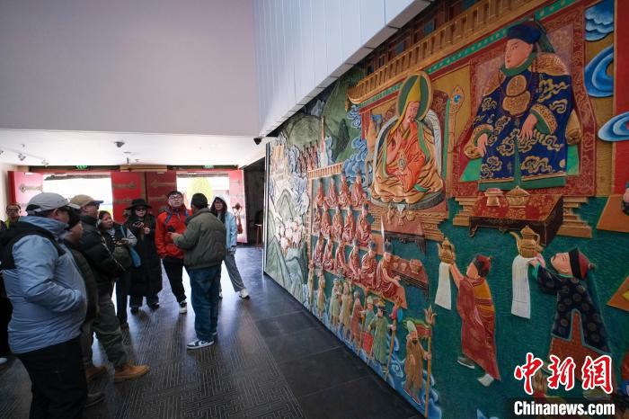 3月18日,游客在布達(dá)拉宮珍寶館參觀五世達(dá)賴?yán)锏奖本┯P見順治皇帝的浮雕。中新社記者 江飛波 攝