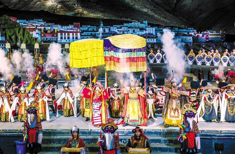 《文成公主》大型實景劇以文成公主入藏為主題,以鑄牢中華民族共同體意識為根本遵循,講述文成公主與松贊干布聯(lián)姻、促進(jìn)民族融合發(fā)展的故事,展現(xiàn)新時代新西藏的獨特魅力和繁榮景象。12年來,該劇累計演出2100多場,演出及園區(qū)旅游配套累計接待觀眾游客超3200萬人次,為當(dāng)?shù)厝罕姲l(fā)放薪資超5億元。
