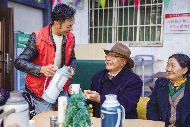 “波啦,您來啦,快坐下來喝點熱茶?!薄澳玻龝顼堅谶@邊吃嗎?”近日,記者來到拉薩市城關區(qū)蕃陽社會工作者和志愿者服務協(xié)會下的策門林老年日間照料中心,剛進大門就被一群正在鍛煉身體的老人所吸引。他們跟著老師抬手、踢腿、扭腰,動作整齊劃一,臉上洋溢著幸福的笑容。鍛煉結(jié)束后,赤來回到助餐區(qū),邊喝甜茶邊吃“卡賽”,和老人們分享趣聞,拉著家常,現(xiàn)場傳來一陣陣歡聲笑語。