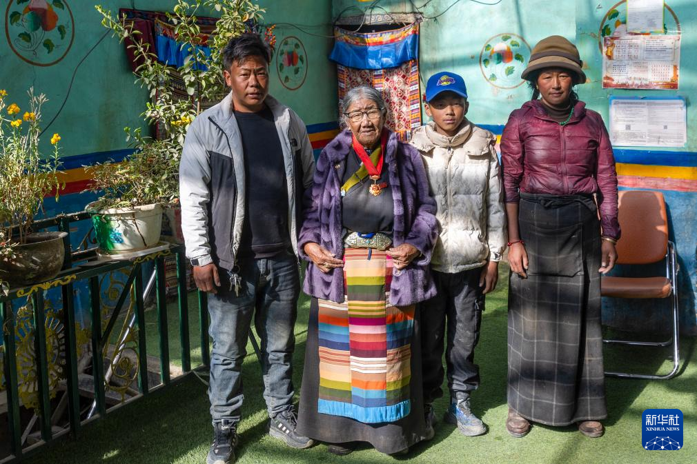 玉珍老人(左二)與孫子羅布次仁(左一)、孫媳婦次仁卓瑪(右一)、曾孫羅布桑珠一起在家中合影(3月17日攝)。新華社記者 姜帆 攝