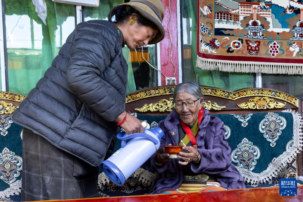 孫媳婦次仁卓瑪(左)在給玉珍老人倒酥油茶(3月17日攝)。新華社記者 姜帆 攝
