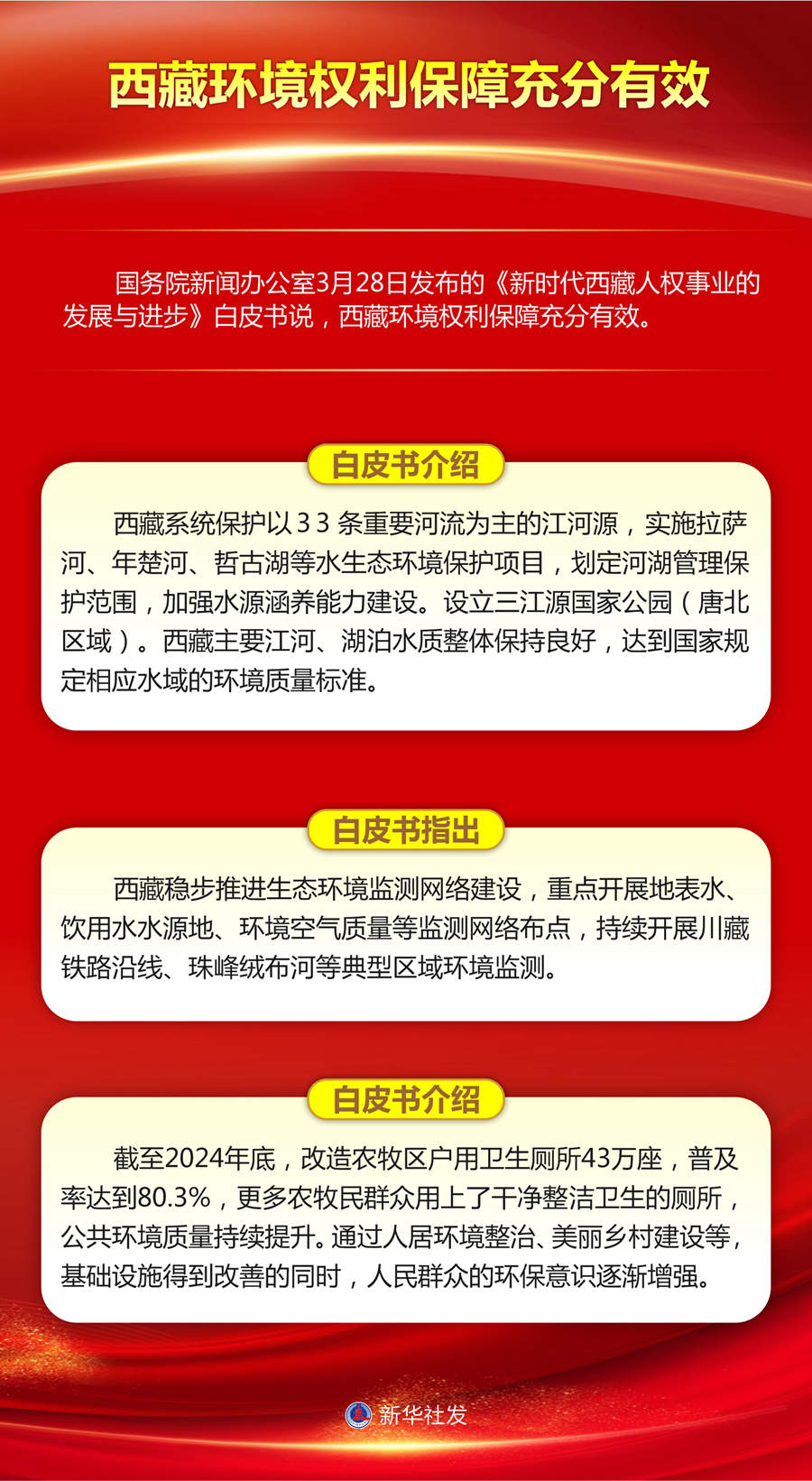 國務(wù)院新聞辦公室28日發(fā)布的《新時代西藏人權(quán)事業(yè)的發(fā)展與進步》白皮書說,西藏環(huán)境權(quán)利保障充分有效。