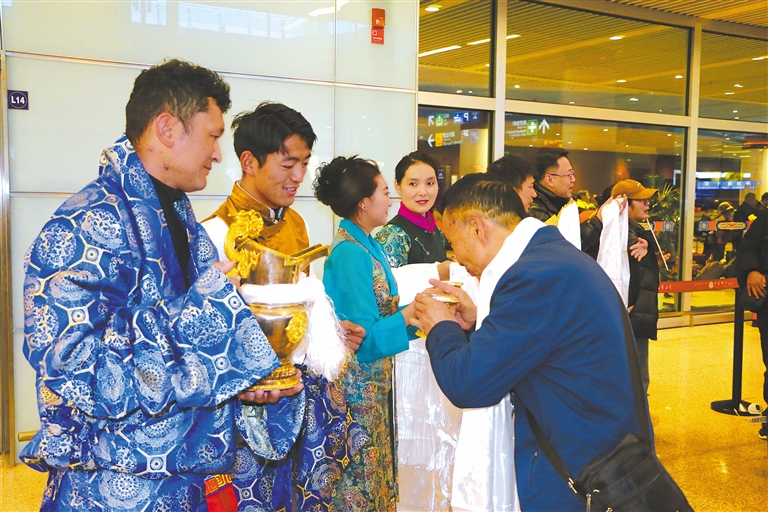 隨著西藏春季旅游的逐步復(fù)蘇,山南市文旅局工作人員身著節(jié)日盛裝,手捧哈達(dá)、切瑪盒、青稞酒,在拉薩貢嘎國際機(jī)場出站口迎接山南第一架旅游包機(jī)的游客。