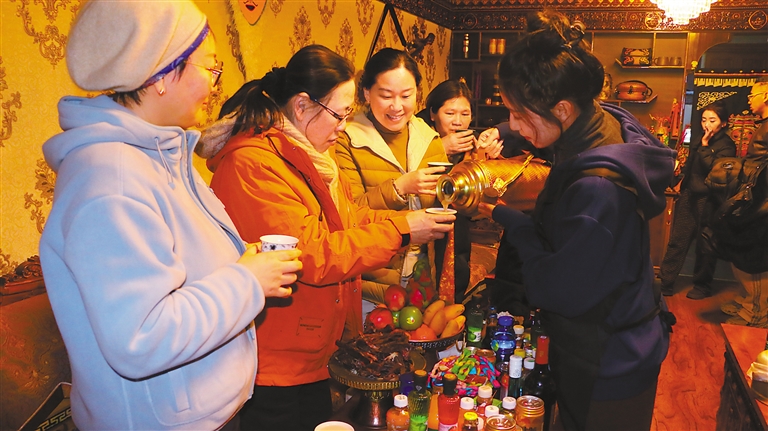 圖為山南市乃東區(qū)扎西曲登社區(qū)居民為游客倒酥油茶。 記者 武沛濤 攝