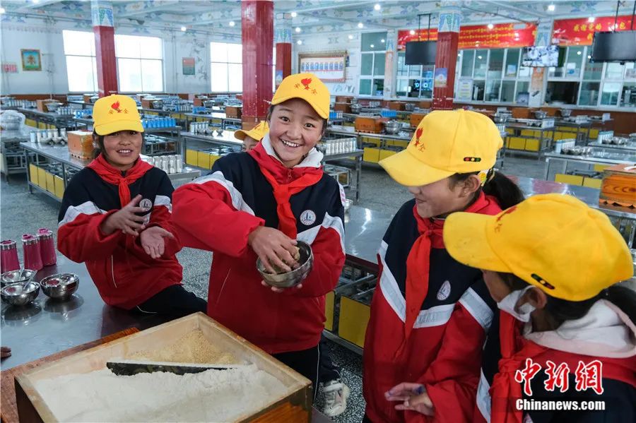 2023年10月13日,班戈縣中石化小學六年級一班尼瑪拉增(左二)在學校食堂捏糌粑,孩子們說她們的早餐便是以糌粑為主。中新社記者 江飛波 攝。