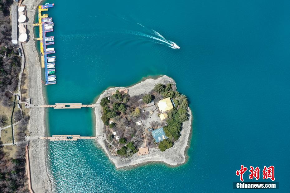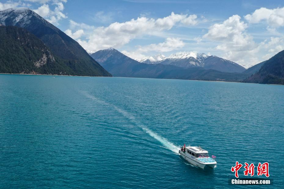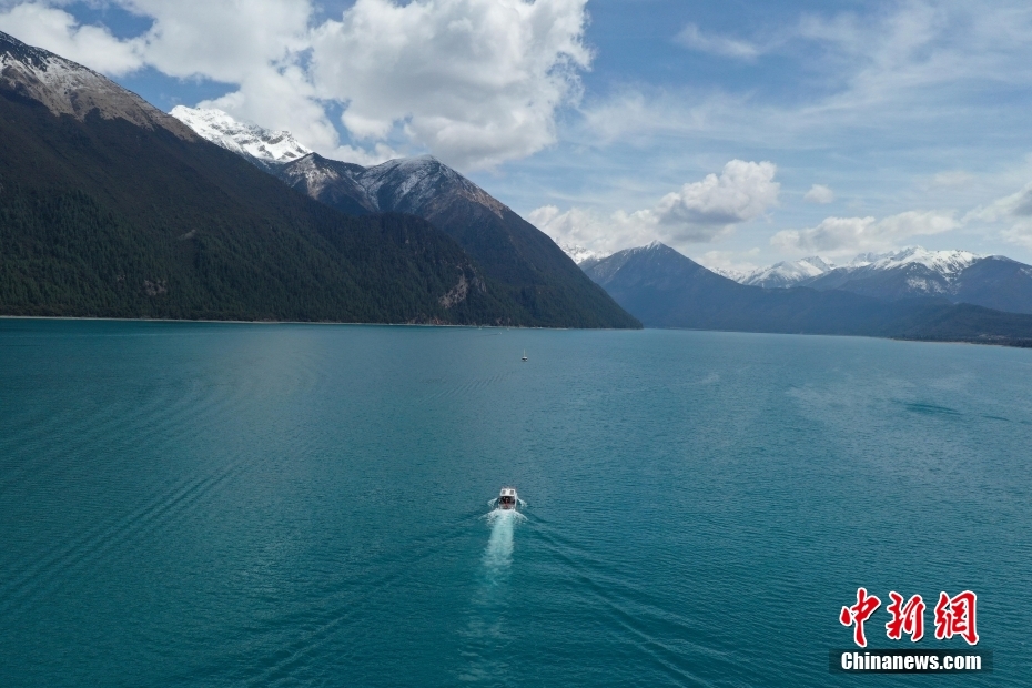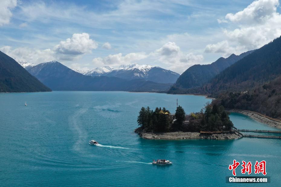 4月6日,西藏林芝工布江達(dá)縣巴松措景區(qū)游人如織。春日里,湛藍(lán)湖水與巍峨雪山相映成趣,游客游玩湖心島或乘船游覽,沉醉在這湖光山色中。圖為巴松措里的游船。(無人機(jī)照片)中新社記者 貢嘎來松 攝