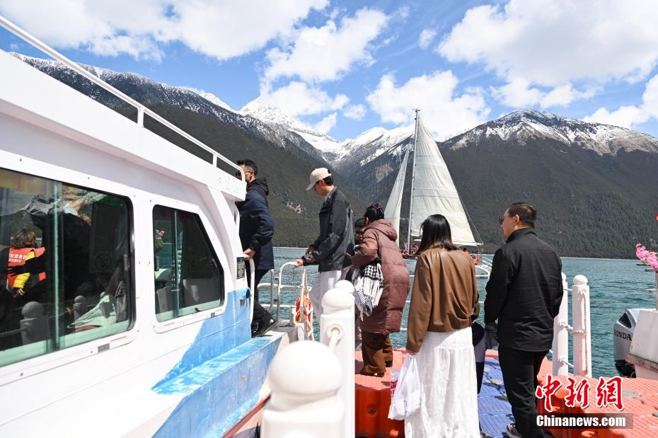 4月6日,西藏林芝工布江達(dá)縣巴松措景區(qū)游人如織。春日里,湛藍(lán)湖水與巍峨雪山相映成趣,游客游玩湖心島或乘船游覽,沉醉在這湖光山色中。圖為游客準(zhǔn)備乘船游覽巴松措。中新社記者 貢嘎來松 攝