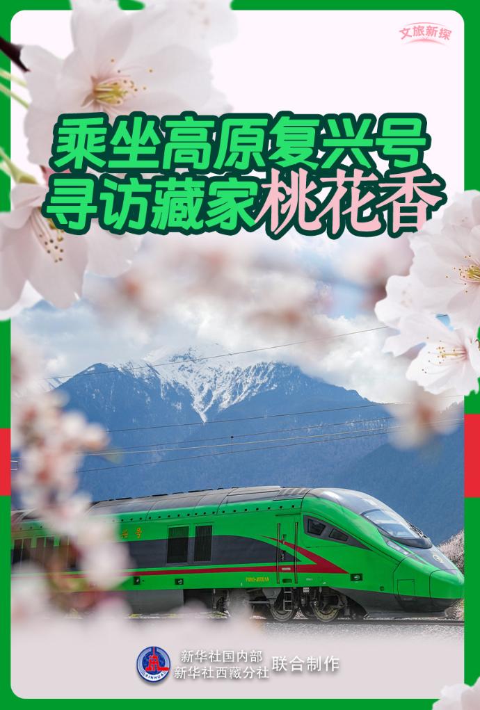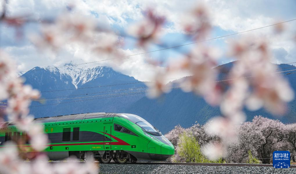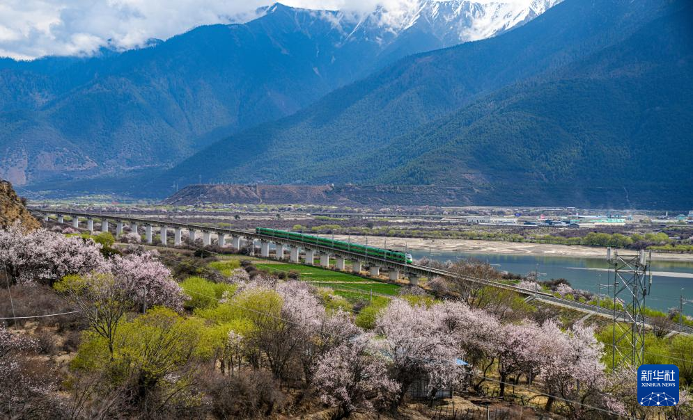 當(dāng)列車駛?cè)肓种ゾ硟?nèi),桃花的盛景會(huì)達(dá)到高潮,野生桃花漫山遍野。車在花中跑,人在畫中游,馳騁的復(fù)興號(hào)動(dòng)車與鐵道旁盛開的桃花構(gòu)成了一幅人與自然和諧共生的畫卷?!暗谝淮慰吹綇?fù)興號(hào)從眼前飛馳而過,就像看見家鄉(xiāng)的雄鷹掠過雪山?!绷种フ景矙z員德吉拉姆說。