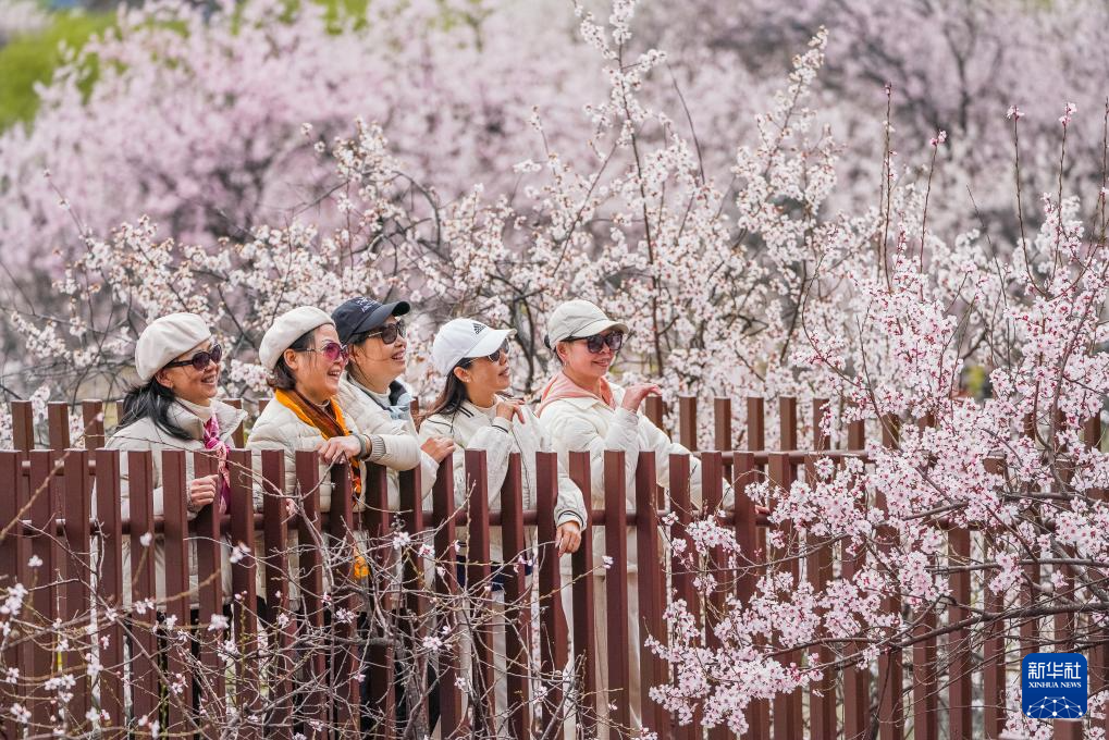 游客在林芝市巴宜區(qū)盛開的桃花中拍照留念。新華社記者 丁增尼達(dá) 攝