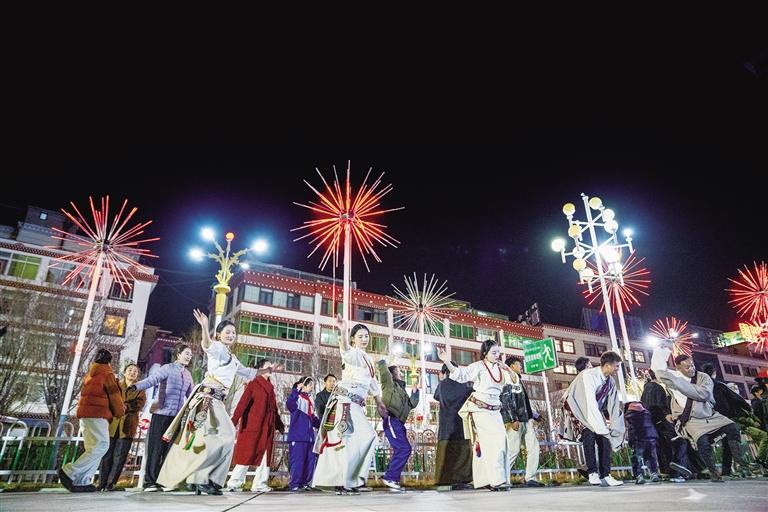 廣場東西橫穿昌都中心城區(qū),全長約150米,布局錯(cuò)落有致,人流涌動(dòng)。漫步在茶馬廣場,兩側(cè)有300余間商鋪,充滿了濃濃的生活氣息。最吸引我們的是廣場一側(cè)的鍋莊舞——男女老少圍成圈,跟著節(jié)奏踢踏轉(zhuǎn)圈,動(dòng)作簡單卻充滿力量。