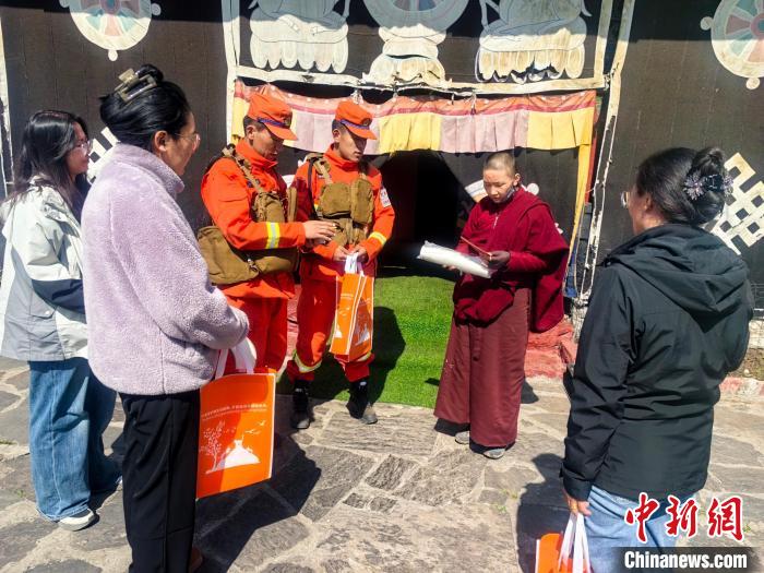 圖為西藏森林消防總隊(duì)隊(duì)員進(jìn)寺廟發(fā)放防火宣傳手冊。王治平 攝