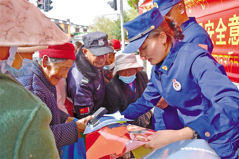4月15日,山南市瓊結(jié)縣組織開(kāi)展第十個(gè)全民國(guó)家安全教育日系列宣傳活動(dòng)。圖為瓊結(jié)縣消防救援大隊(duì)工作人員向群眾發(fā)放宣傳資料。記者 孫開(kāi)遠(yuǎn) 攝