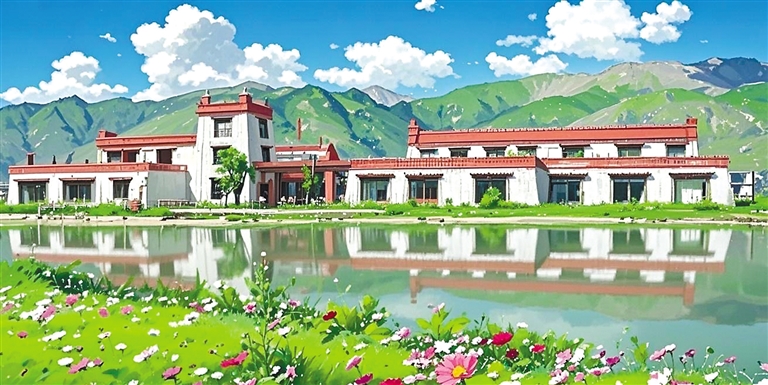 “我就是想以動畫風格給大家展示不一樣的堆龍?!钡┰隼氛f。只見她又將照片導入AI圖片生成軟件內,AI自動識別圖像元素——經(jīng)幡的布料特性、水流的物理參數(shù)、建筑材質的反光數(shù)據(jù)。輕點“生成”按鈕,1分23秒后,一張動畫風格的Shadada CoffeeX新型公共文化空間的圖片便呈現(xiàn)在眼前。重點不是技術,是審美把關,旦增拉姆指著屏幕上的失敗案例:“AI把青稞田處理成糖果色卡通,把圖書館渲染成賽博朋克風格。我每天要調整無數(shù)次參數(shù),就像教AI理解什么是藏地美學。”她用最現(xiàn)代化的數(shù)字工具,“描繪”著堆龍德慶區(qū)新的光影詩篇。
