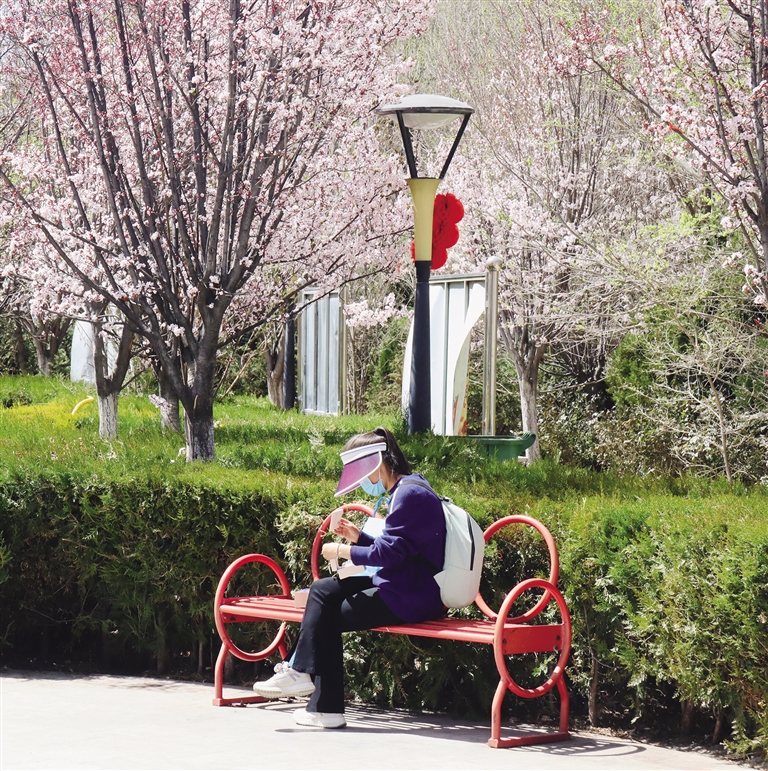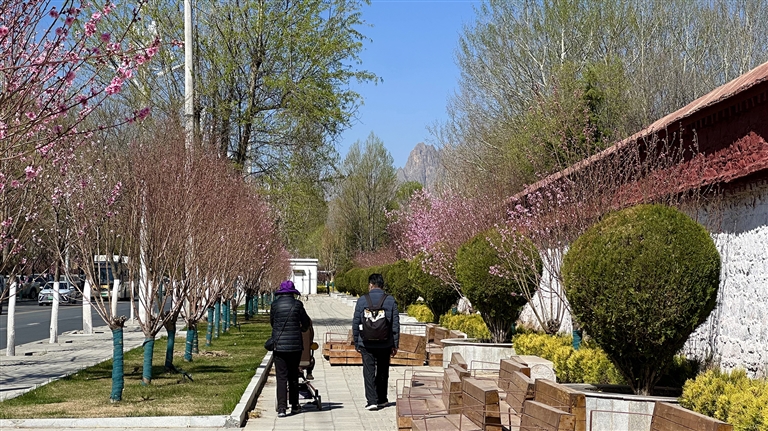 這幾條路相連接,一路都是榆葉梅、紫葉李、桃樹(shù)等,成團(tuán)成簇的花朵裝點(diǎn)著街道,綠化帶里的蒲公英也冒出頭來(lái),小黃花零星綻放。一路走來(lái),有看不完的花,賞不完的景。你只需放慢腳步,便能在最常走的路上,邂逅拉薩明媚的春光。