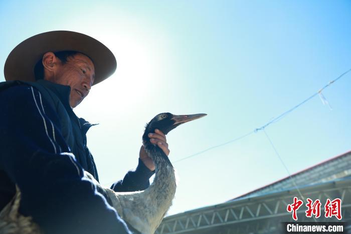 圖為尼瑪次仁與康復的黑頸鶴在放歸前的合影。洛克 攝